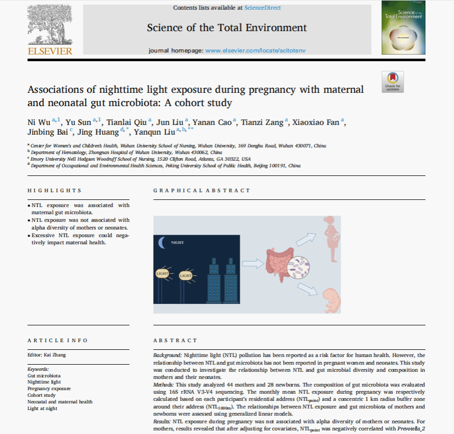 刘燕群课题组在环境科学高水平期刊Science of the Total Environment(中科院一区TOP期刊)杂志上发表了题为“Associations of nighttime light exposure during pregnancy with maternal and neonatal gut microbiota: A cohort study”(妊娠期夜间灯光暴露与母婴肠道菌群的联系:一项队列研究)的研究成果。该研究发现妊娠期夜间灯光(Nighttime light,NTL)暴露会显著影响母亲的肠道菌群,并讨论了其潜在的健康风险。研究结果对未来的孕妇健康管理具有重要意义。黄瓜视频