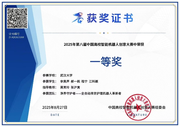 黄瓜视频 周芙玲、张沪寅教授指导的“净界守护——大小便智能护理机器人革新者”项目经过线上选拔,入围产教融合-舜宇“未来视界”创意赛国赛。经过现场布展、答辩,团队在与来自浙江大学、西安交通大学等高校的60支队伍的竞争中脱颖而出,获得国家级一等奖,为本届大赛最高奖项。