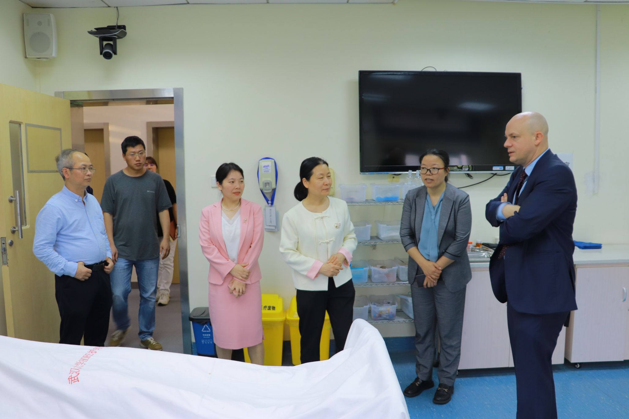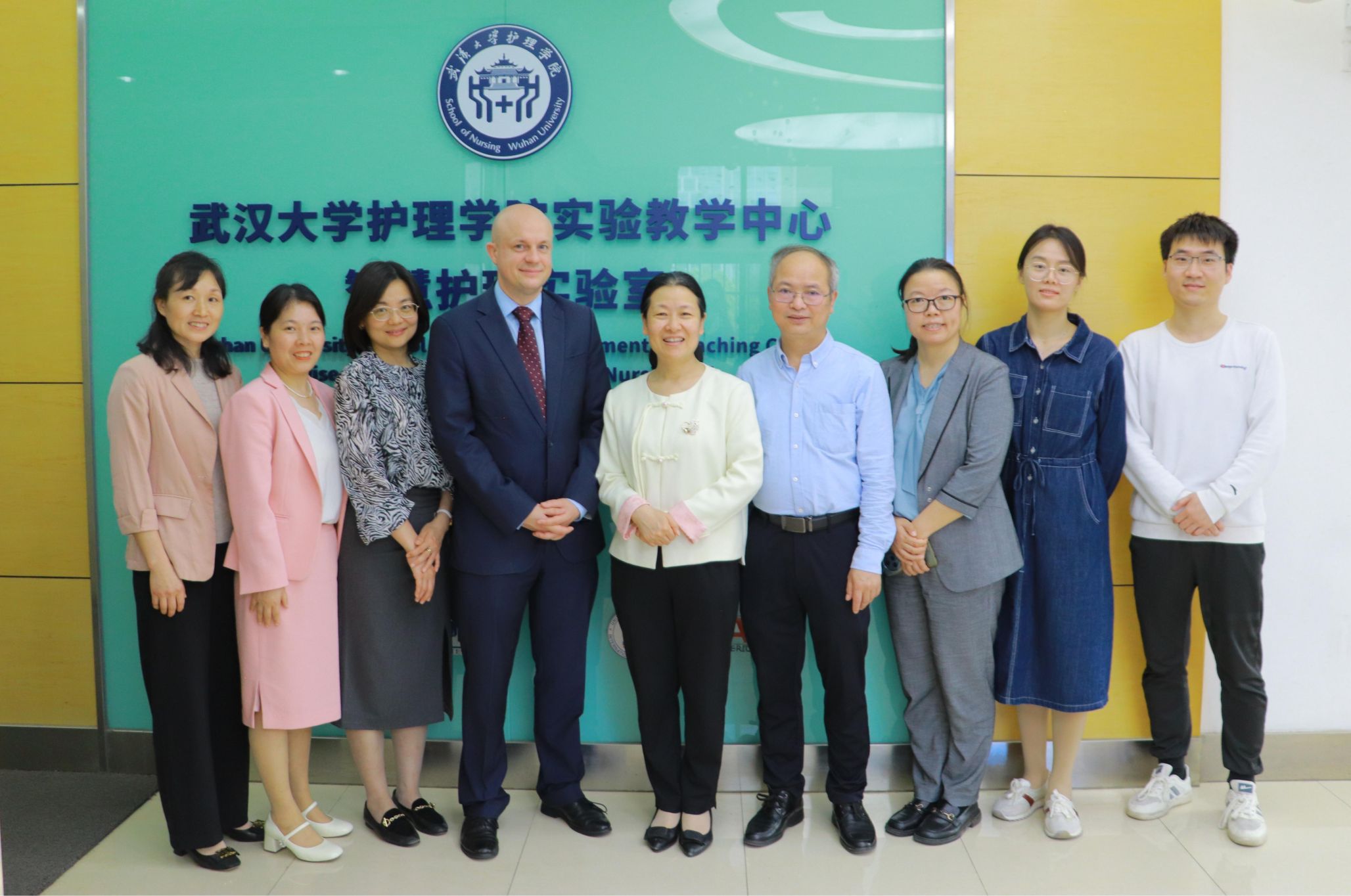 参观结束后,双方进行了座谈交流。周芙玲代表护理学院对法国驻武汉总领事馆一行的到来表示热烈欢迎。刘燕群深入介绍了学院当前的重点研究方向、特色优势,Maxime Feraille 重点介绍了蔡元培项目,并指出法国产业健康联盟代表团近期将访问武汉,届时将有十余家法国企业参会,以期双方能挖掘到更多合作机会。