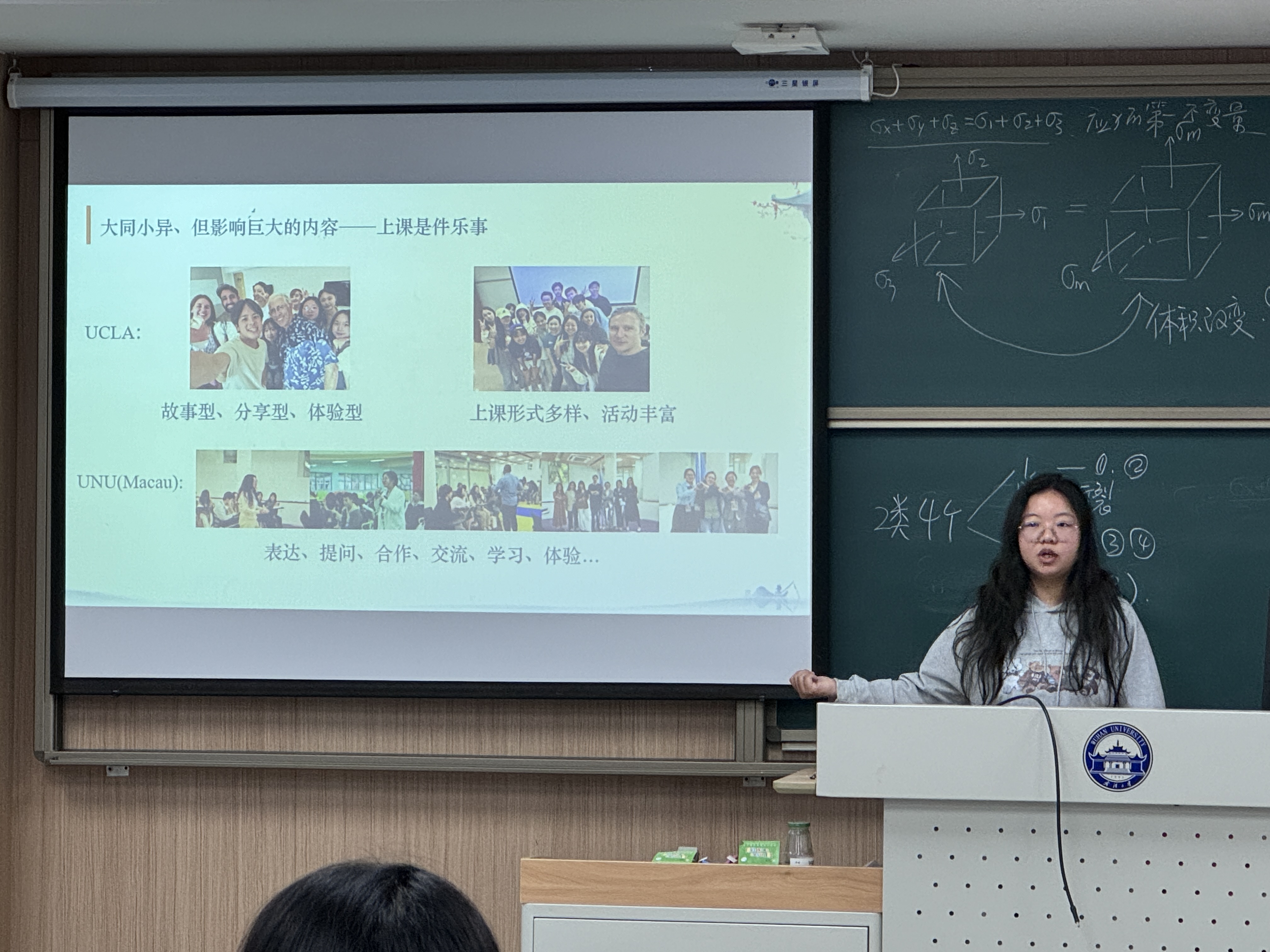 聂梦缘同学分享了在加州大学洛杉矶分校UCLA课程中老师们新颖独特的教学方式,充满趣味和魅力的课堂让她收获了奇妙的课程体验。此外,她向同学们细致地分析了参与各种境外交流项目的利弊,并分享了参与项目的途径,鼓励大家勇敢尝试。