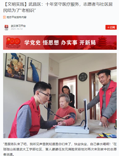 师生们投身于志愿服务活动,得到街道、机构、学校、居民的高度好评,同时在国家级、校级大学生创新训练项目中取得优异成绩,被武汉晚报、楚天都市报、武汉学习文明网等多家媒体报道,学习强国武汉学习平台进行转载。