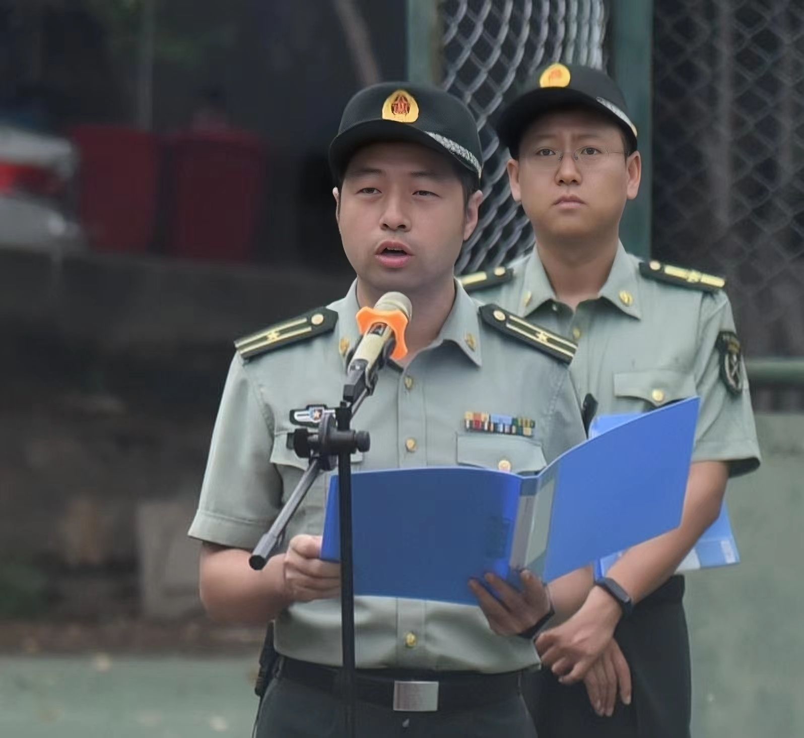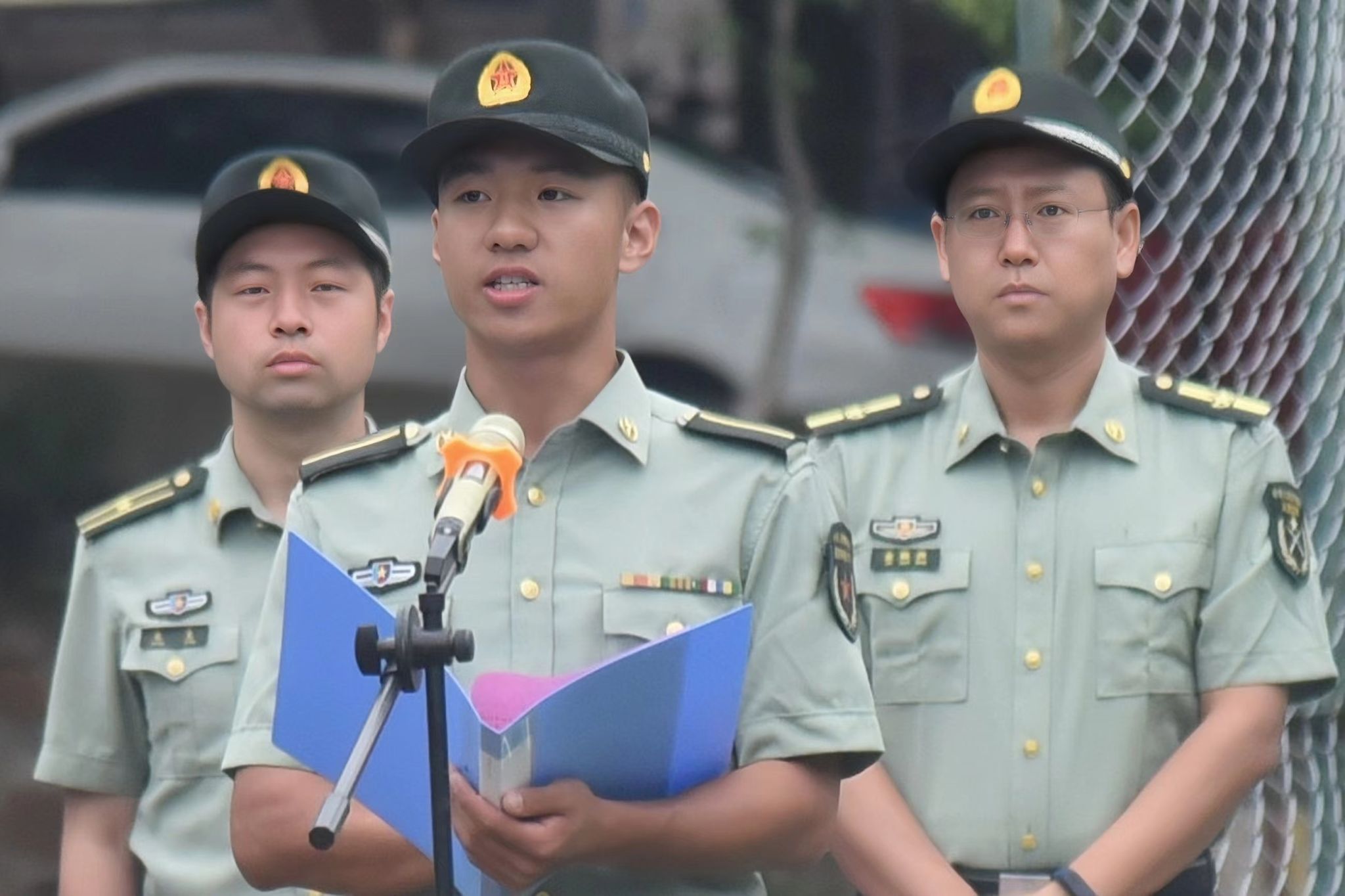 会议第三项,王涛锋教官代表全体承训教官发言。他表示,全体教官将坚决做到听招呼、守纪律,科学组训、文明施训,加强沟通、相互配合,以昂扬的精神状态、务实的训练作风和一流的管理标准,全身心投入到军训过程中,确保军训任务高标准、高质量完成。