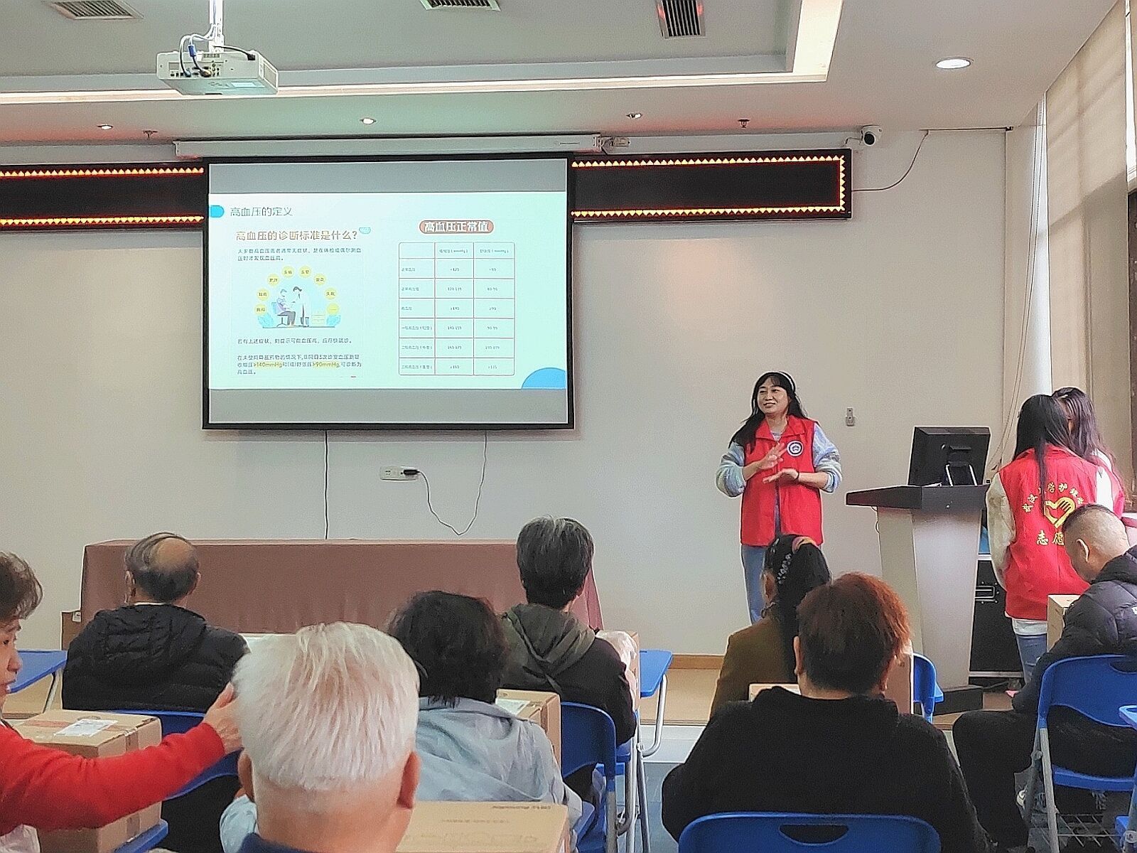 本次活动包括两个部分,科普宣讲和健康义诊。科普宣讲部分,志愿者为老年人讲解了高血压高血糖注意事项和认知症基本知识。首先,张雪梅同学讲解高血压高血糖的注意事项。她详细介绍了高血压和高血糖的成因,以及如何通过合理的生活方式和饮食来进行控制,特别强调了定期检测血压和血糖的重要性。同时她也通过具体的案例,生动的向老年人解释了如何在日常生活中保持适当的运动和饮食平衡。