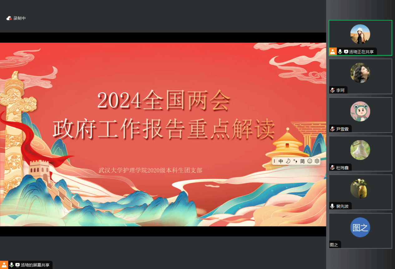 2020级本科生团支部于线上举行以“2024全国两会政府工作报告学习”为题的主题团日活动。主讲人汤琦重点介绍了2023年政府工作总结,带领大家回顾了包括国内生产总值增长、粮食产量、城镇新增就业等方面在内的耀眼成绩,帮助大家通过对过去的总结回顾认识到高质量发展的重要性。习近平总书记在工作总结中提出要因地制宜发展新质生产力,强调各地各部门在发展新质生产力时,立足自身实际,确保发展有序推进,同学们受益匪浅。