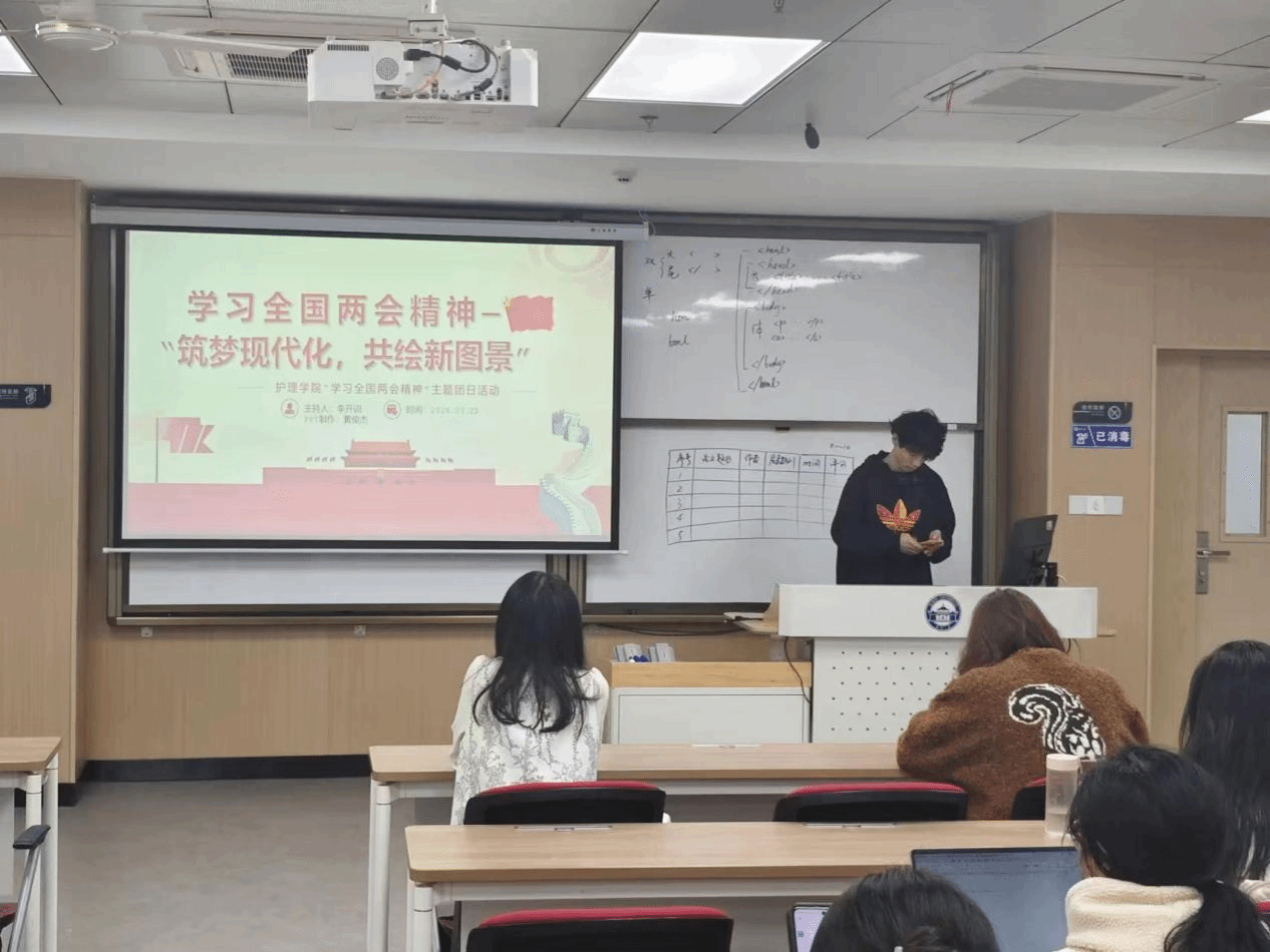 医学部2号楼241教室开展主题团日。团支书宋海瑞向班级同学作两会精神传达报告,重点从第十四届全国人民代表大会第一次会议概况、过去一年计划以及未来五年规划、今年发展主要预期目标、2024年政府工作任务四个方面进行了分享,使同学们更加全面地学习了政府工作报告。通过这次活动,大家了解到在异常复杂的国际环境和艰巨繁重的改革发展稳定任务下,政府坚持以人民为中心的发展思想,全面推进经济建设、政治建设、文化建设、社会建设和生态文明建设取得的显著成绩。大家纷纷表示,要紧紧跟随党的步伐,通过政府工作报告知晓国家未来发展目标,为未来就业后为社会发展献力作出贡献。