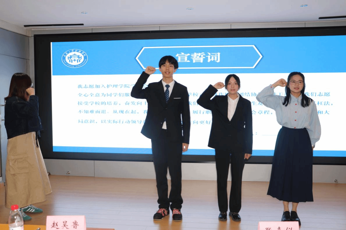 第四届学生会主席团成员,即:张茜雅、易曾堂、蒋秀坪。三位新任主席团成员在第三届主席团成员傅雨馨的带领下进行志愿宣誓。