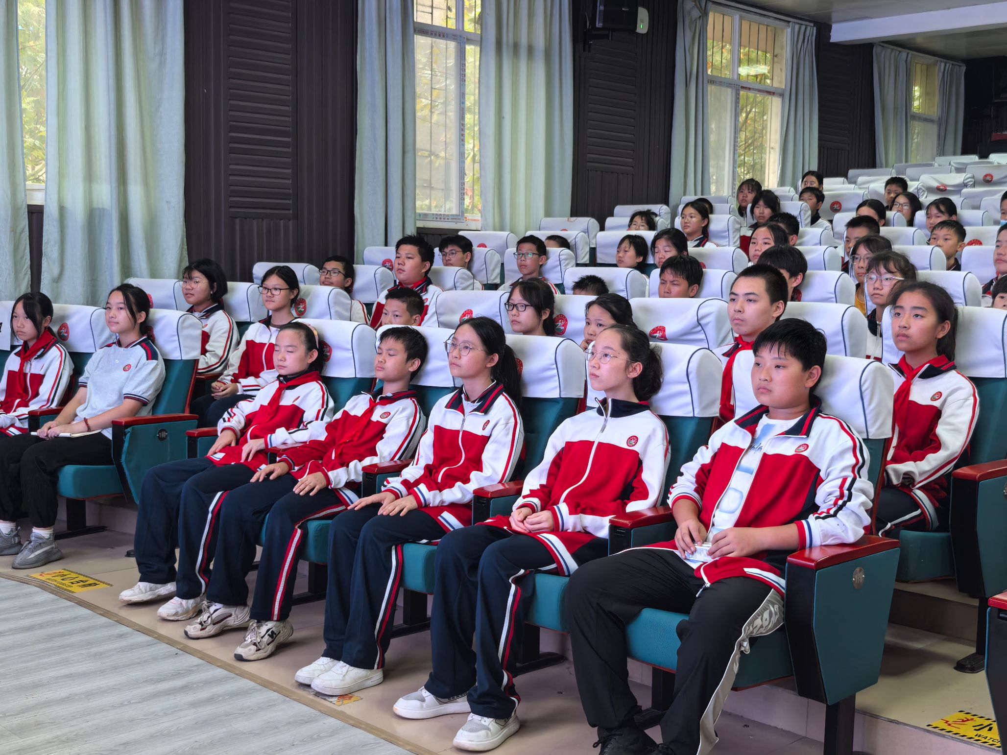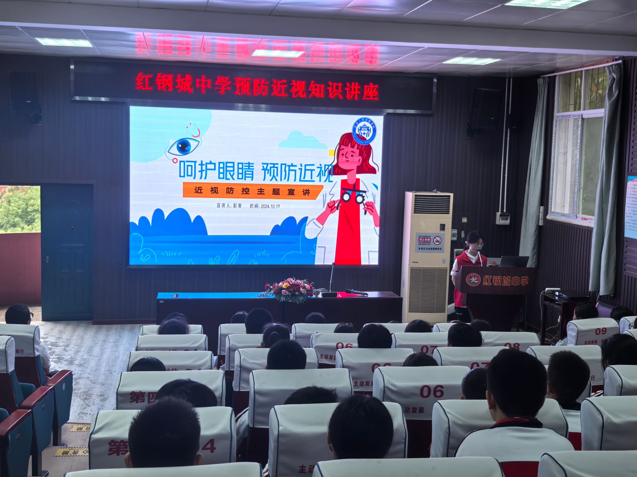 随后,彭爽围绕“近视预防”展开了宣讲。她通过一组数据展示了当前青少年视力问题日益突出的现状,并强调视觉是人类最重要的感官,呼吁同学们务必好好呵护眼睛。接着,她带领同学们实操了预防近视的“四不要”和“三要”,提醒他们养成良好的用眼习惯,如保持正确的阅读姿势、定期做眼保健操、合理安排学习和休息时间等。
