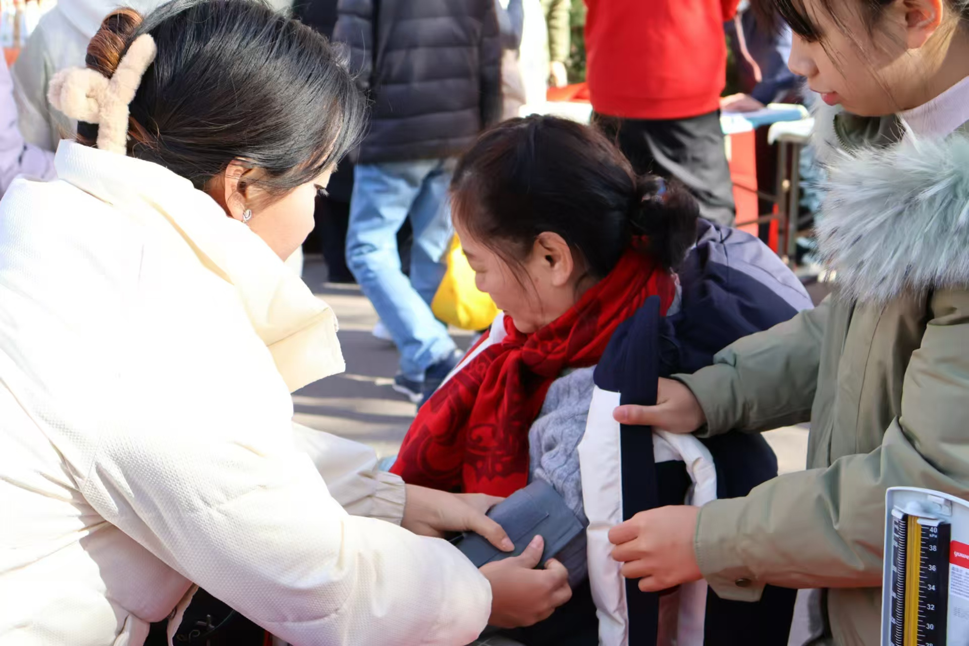 2025年1月9日上午八点,同学们准时到达老年活动中心集合并整理好物资。上午,他们为居民测量血糖和血压,讲解正常值范围及高血压、低血压、高血糖、低血糖的生活和饮食注意事项,还普及冬季常见疾病(如流感和诺如病毒感染)的预防知识。