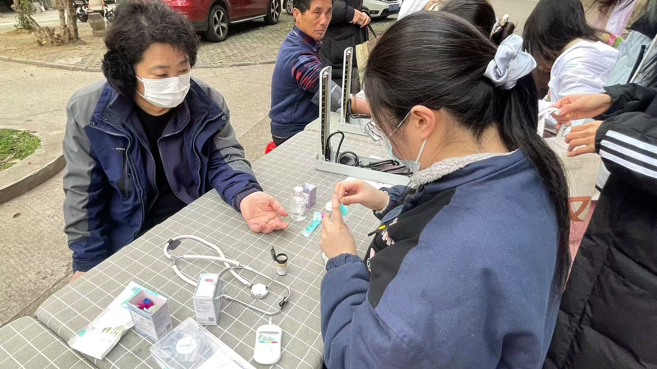 水生所社区内,同学们忙碌地摆放物资、搬桌椅、贴春联、挂灯笼,社区洋溢着蛇年新春喜庆。九点义诊开始,寒冷天气下,同学们注意为居民披外套、帮老人看管物品、搬凳子,体现护理人文关怀。同学还组织赠送大白菜活动,白菜寓意“百财”,送上对居民美好祝福。