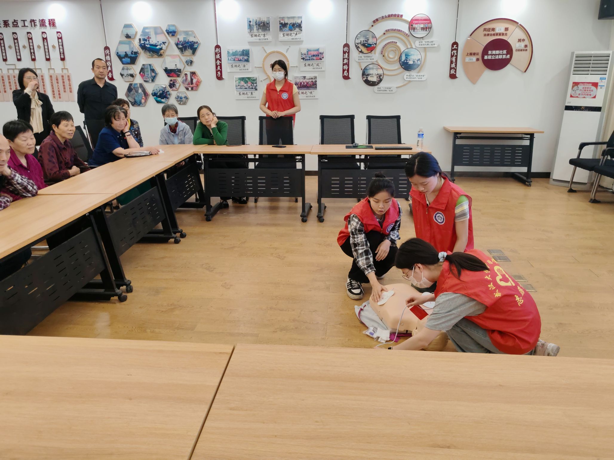 志愿服务团队走进东湖路社区,开展了一场以“普及急救知识,守护生命健康”为主题的急救知识宣讲活动。此次活动旨在提高社区居民的急救意识和技能,帮助社区居民在突发情况下能够正确应对、科学施救。宣讲内容包括心肺复苏(CPR)、自动体外除颤器(AED)使用以及海姆立克急救法的讲解与演示,活动环节吸引了众多社区居民的积极参与。