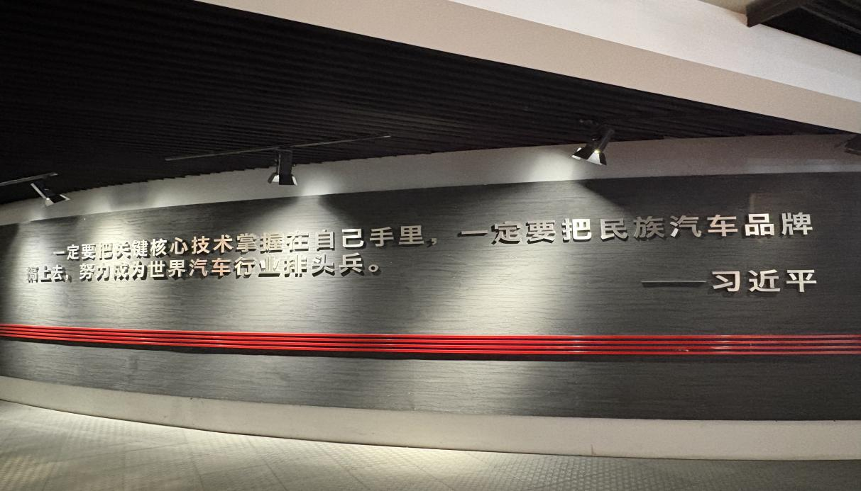 随后,实践团步入红旗文化展馆。在 “旗创奋斗” 展区,一辆1958年的东风牌小轿车静静陈列。其红白双拼的车身设计独具特色,龙形标识更是彰显着浓郁的中国元素。据了解,该车命名源于“东风压倒西风”的著名论断,它标志着中国自主制造小轿车的开端,承载着那个年代中国工业自主探索的坚定决心,是新中国工业发展历程中的关键见证。而一旁的红旗CA72J同样引人注目,作为1959年建国十周年阅兵检阅车,它标志着中国拥有了自主研发的国车礼宾车。展区内,毛泽东主席乘坐的防弹专车,以及邓小平、江泽民同志乘坐的检阅车同款车型等,不仅诉说着红旗作为“国车”的无上荣耀,更串联起新中国的重大历史时刻,让队员们仿佛穿梭于历史长河,在工业展品中清晰触摸到党史与新中国史的脉络。