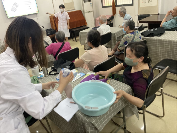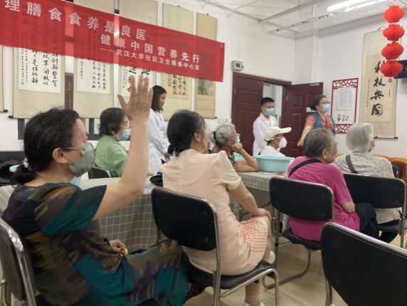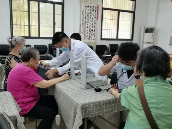 活动初始,同学们为来参加讲座的老人们测量血压、询问居家用药管理,通过了解老人的日常生活情况,为老人提供可借鉴的健康指导。