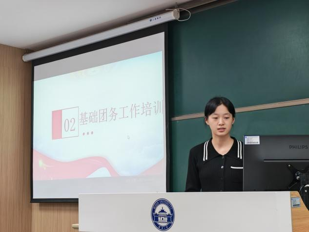 学生团委副书记沈心对同学们进行了基础团务工作培训,为新生团员详细讲解了“三会两制一课”、团组织关系转接、团内激励、团支部“对标定级”工作等内容,引导同学们对团员的基本权利和义务、团的组织生活制度、评优评先机制等建立基本认知。通过培训,同学们清晰知晓了团员的责任与权益,强化了对共青团员时代使命的认同,进一步增强了组织归属感与纪律意识。