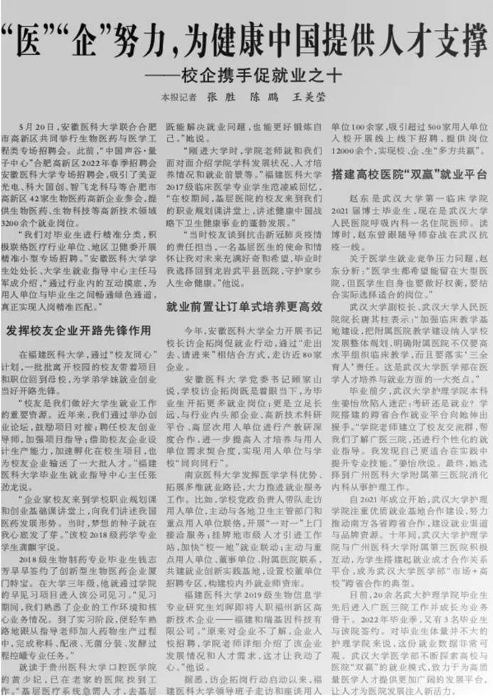 2022年7月14日,《光明日报》头版以《“医”“企”努力,为健康中国提供人才支撑》为题报道了黄瓜视频