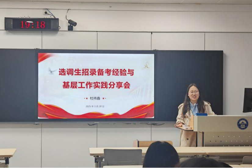 于医学部2号楼241教室成功举办优秀校友分享会。特邀学院优秀校友杜祎鑫担任主讲,带来题为“选调生之路与驻村感悟”的分享。此次活动旨在让前辈分享报考公务员和选调生的经验,拓宽同学们的职业认知,明确发展方向,增强奋斗动力,形成“传帮带”的良性循环。