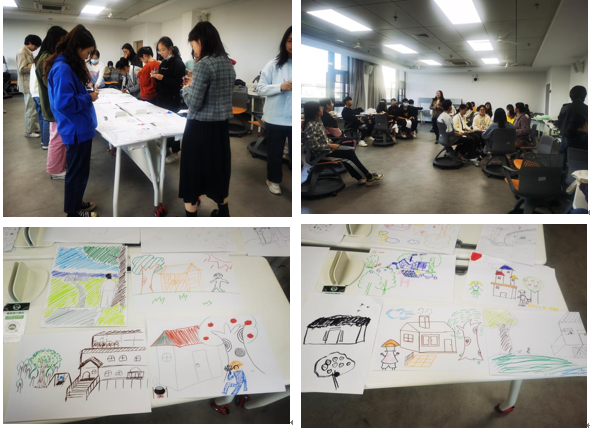 第二部分同学们分两组在两个智慧教室体验团体心理治疗。分别体验了“交换命运之牌”、“‘屋树人’绘画治疗”的活动。同学们参与非常积极,表现出很强的兴趣。在分享和交换“命运”、自己绘画以及和同学的的互动交流过程中,同学们体会并审视了自身的情绪,看到了自己和他人不同的一面;在进一步深入交流的过程中,他们互相交换秘密,更体会到了心理学带给人的奇妙体验。