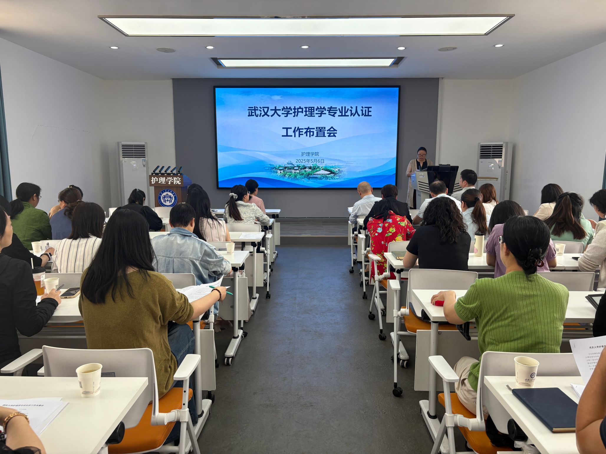 护理学专业认证工作布置会在 2601 召开。学院党委书记赵昊鲁、院长周芙玲及学院全体教师、中南医院、人民医院和武汉市精神卫生中心相关人员参加了会议,会议由副院长杨冰香主持。