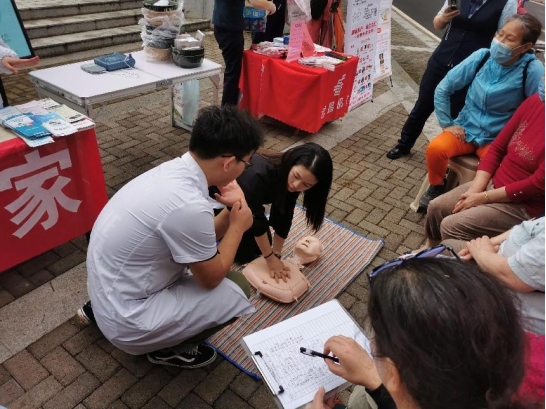 前往健康义诊地点的居民大多为老年人。社区老年人对于自身健康更为关注,路过的时候都会测量血压,并且留下来听我们开展的“心肺复苏急救小课堂”。每一位志愿者都能够有条不紊的为居民完成血压的测量。测量完成后也会和老人们聊聊天,了解老人们平时血压的测量结果,是否持续用药和定期监测血压等。一位负责测量血压的志愿者分享到:“我认为此次社区义诊活动非常有意义,将我们所学知识服务于社区居民。一部分老年人会因为血压测量结果并不理想而十分担忧,我们也会提供健康宣教,告知其需要按时服药,定期检查。服务过程也能够促进我们对前期知识进行运用与理解,希望在下一次社区实践中能够更好的服务社区。”