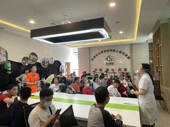 5月19日上午,喻惠丹老师带领团队成员们前往放鹰台附近的阳光家园,为社区残障人士进行知识科普讲座;下午,余立平老师、孟宪梅老师带领团队成员们前往青鱼嘴社区党员群众服务中心的阳光家园进行日常急救知识科普讲座,并在阳光家园的老师的带领下参观了阳光家园为残障人士设计的娱乐、休闲场所。