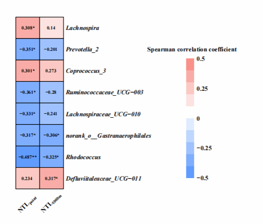 图 2 NTL暴露与新生儿肠道菌群在属水平上的相关性