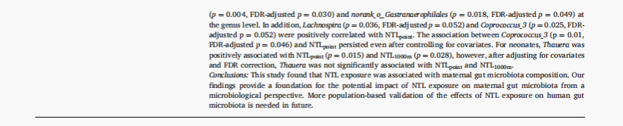 因此该课题组基于已建立的母婴队列开展了妊娠期NTL暴露对母婴肠道菌群的影响研究。NTL数据来源于佩恩公共政策研究所地球观测小组,本研究将研究对象妊娠期的月度NTL暴露根据其住址(NTLpoint)和住址周围半径为 1 公里的同心缓冲区(NTL1000m)进行分类分析。研究结果发现,就母亲而言,在调整协变量后,NTLpoint与 Prevotella_2、norank_o__Gastranaerophilales菌属呈负相关。Lachnospira和 Coprococcus_3菌属与 NTLpoint呈正相关(图1),在控制协变量后,只有Coprococcus_3菌属与 NTLpoint 之间的关联存在。对于新生儿,Thauera菌属与 NTLpoint和 NTL1000m呈正相关(图2),但是,在对协变量进行调整和 FDR 校正后,Thauera菌属与NTLpoint 和 NTL1000m并无显著相关。这些发现首次提供了妊娠期NTL暴露与母亲肠道菌群之间存在重要关联的证据,为未来从环境风险因素角度进行孕妇的健康管理提供了理论依据。