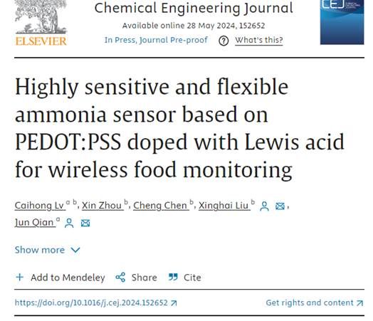 智慧护理工程研究中心钱俊教授团队在氨气传感与器件领域的研究成果,论文题目为“Highly sensitive and flexible ammonia sensor based on PEDOT:PSS doped with Lewis acid for wireless food monitoring”。黄瓜视频