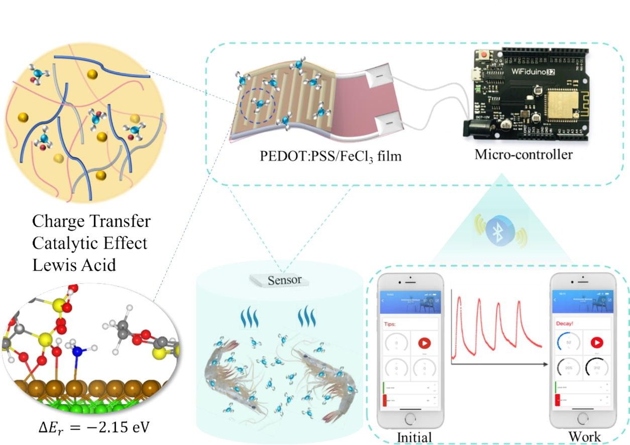 氨是食品变质的重要标志物,但目前的传感器缺乏足够的灵敏度、稳定性、选择性和自动化,在实际应用中无法实现现场实时监测。为解决上述局限性,本研究提出了一种基于PEDOT:PSS掺杂Lewis酸的高灵敏度柔性氨传感器,用于无线食品监测。薄膜中的Fe3+和水解的H+与PSS链上的SO3−基团配位引起的插层效应导致相邻的富PEDOT域之间的距离增加。通过在PEDOT:PSS分子内提供额外的离子型载流子和载流子传输路径来增强氨敏感性。结果表明,FeCl3掺杂的PEDOT:PSS传感器的灵敏度显著提高,在25℃下,对1 ppm NH3的响应值约为25 %,检测限为0.23 ppm,定量限为0.78 ppm(1 - 400 ppm)。此外,传感器在1 ppm (RSD = 4.30 %)和100 ppm氨(RSD = 3.61 %)下均具有可接受的重复性,且具有良好的选择性和长期稳定性。XPS、拉曼分析和密度泛函理论(DFT)计算进一步阐明了该传感器对氨的传感机理。最后,设计了一种便携式无线检测装置,通过蓝牙通信和单片机系统对新鲜基围虾的腐败过程进行检测,利用智能手机实现了对食物新鲜度的无线实时监控。