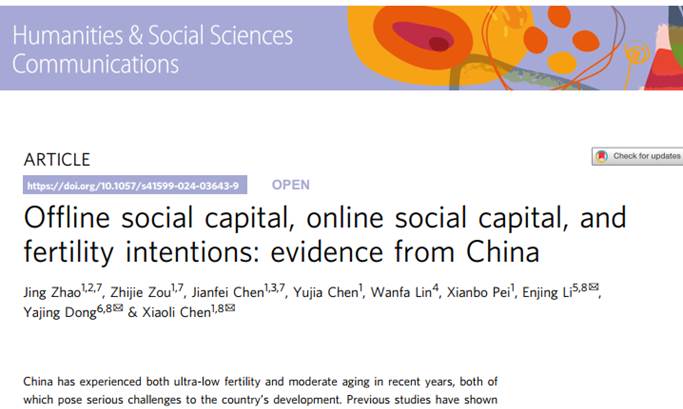 教授陈晓莉课题组的最新科研成果。论文题目为“Offline social capital, online social capital, and fertility intentions: evidence from China”(线上社会资本、线下社会资本与生育意愿:来自中国的证据)。黄瓜视频