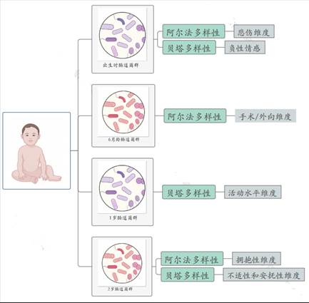 气质是指基于本质的个体在反应性、情感和自我调节方面的差异,反映情感动机和注意风格,是儿童早期行为测量的中心结构。先前的研究指出气质与人类肠道菌群的变化密切相关有关,但目前尚无纵向研究探讨生命早期前两年肠道菌群的变化在幼儿气质发展中的作用。因此,本研究开展了一项为期两年的队列研究,通过收集婴儿出生时,6月龄,12月龄和24月龄的粪便样本,并评价幼儿2岁时的气质特征。研究结果发现婴儿出生时的阿尔法多样性与幼儿气质的悲伤维度成负相关,婴儿出生时的贝塔多样性和幼儿气质的负性情感密切相关;婴儿6月龄时的阿尔法多样性和幼儿气质的手术/外向维度成负相关;婴儿1岁时的贝塔多样性和幼儿气质的活动水平维度密切相关;婴儿2岁的阿尔法多样性和幼儿气质的拥抱性维度成负相关,婴儿2岁时的贝塔多样性和幼儿气质的不适性和安抚性维度密切相关(见下图)。