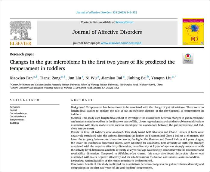 刘燕群课题组在《Journal of Affective Disorders》期刊上发表了关于生命早期前两年肠道菌群变化和幼儿气质之间联系的最新研究进展。该论文题目为“Changes in the gut microbiome in the first two years of life predicted the temperament in toddlers”。黄瓜视频