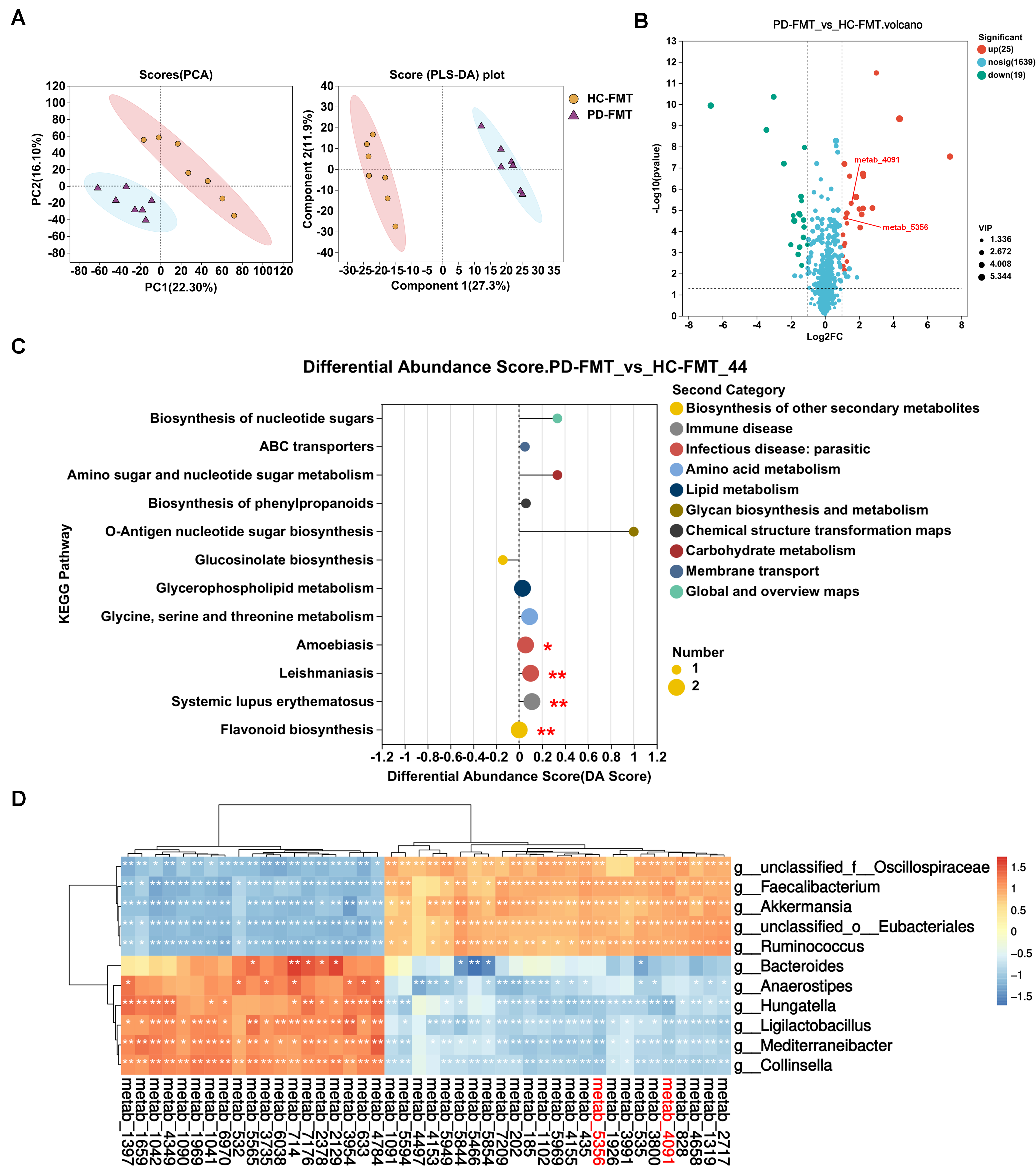 进一步的宏基因组测序与非靶向代谢组学分析发现,这些小鼠的肠道菌群组成与代谢功能发生显著改变,具体表现为:联合乳杆菌(Ligilactobacillus)显著减少,阿克曼氏菌(Akkermansia)明显富集等(图2),且甘油磷脂代谢出现异常(图3)。