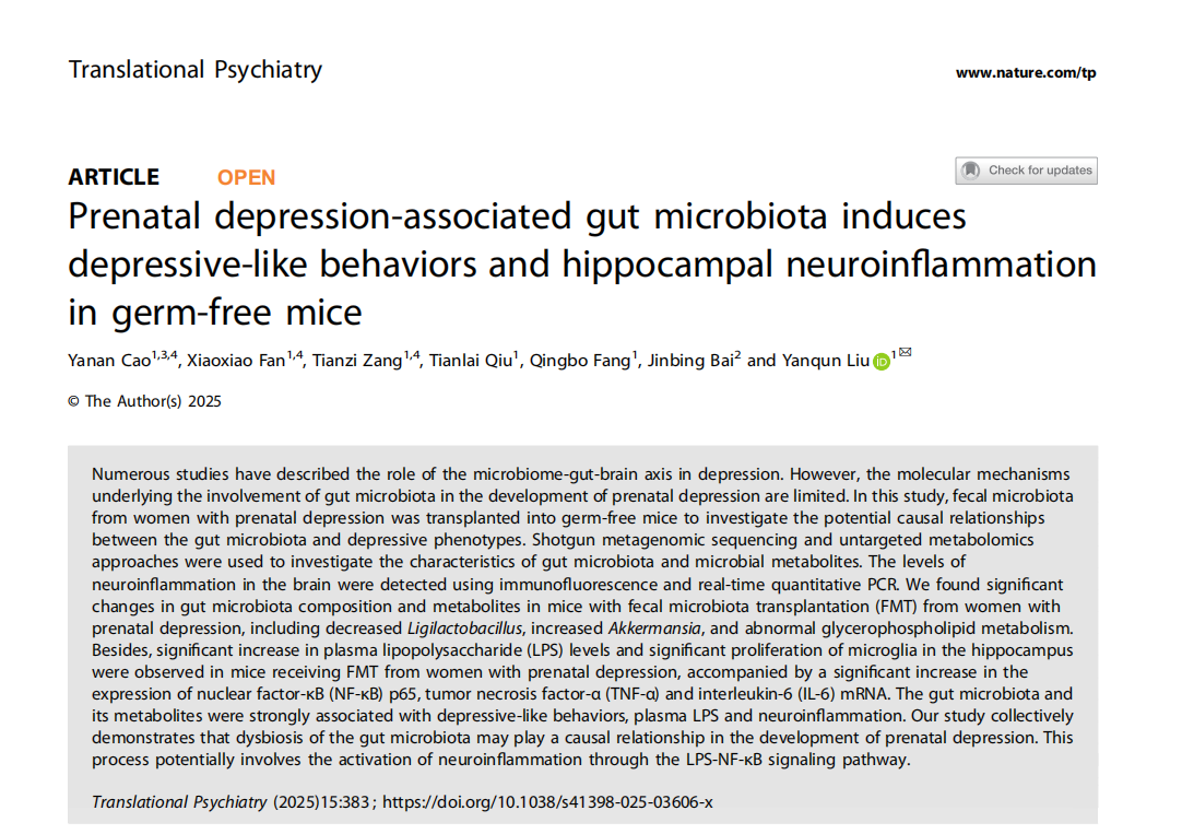 刘燕群课题组在Translational Psychiatry上发表题为“Prenatal depression-associated gut microbiota induces depressive-like behaviors and hippocampal neuroinflammation in germ-free mice”的研究论文。该研究首次通过跨物种粪菌移植实验证实,产前抑郁相关肠道菌群失调能够诱发无菌小鼠的抑郁样行为,具体作用机制为菌群失调改变宿主的代谢功能,使免疫调节失能,激活核因子κB(Nuclear Factor kappa B, NF-κB)信号通路,引起小胶质细胞介导的神经炎症。该发现为肠道菌群失调与产前抑郁之间的因果关系提供了最直接的实验证据。黄瓜视频