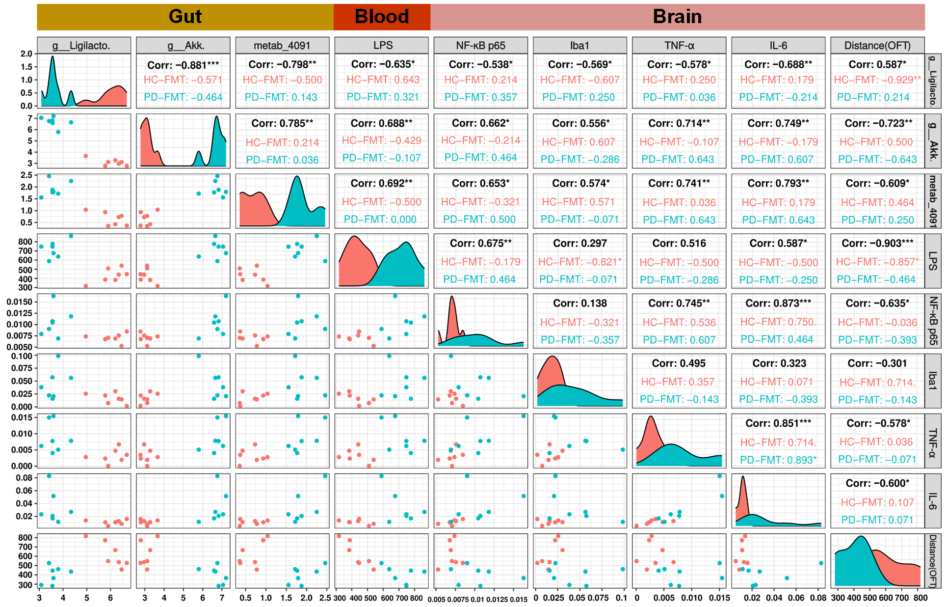 此外,该组小鼠血浆中的脂多糖(Lipopolysaccharide, LPS)水平显著升高,海马区小胶质细胞数量显著增多,并伴随NF-κB p65、肿瘤坏死因子-α(Tumor Necrosis Factor-α, TNF-α)与白细胞介素-6(Interleukin-6, IL-6)的mRNA表达上升(图4)。进一步相关分析表明,肠道菌群及其代谢产物与抑郁样行为、血浆LPS水平及神经炎症指标密切相关(图5)。本研究首次从因果角度证实,肠道菌群失调可能在产前抑郁发生中扮演关键角色,其机制可能与LPS-NF-κB信号通路介导的神经炎症激活有关。
