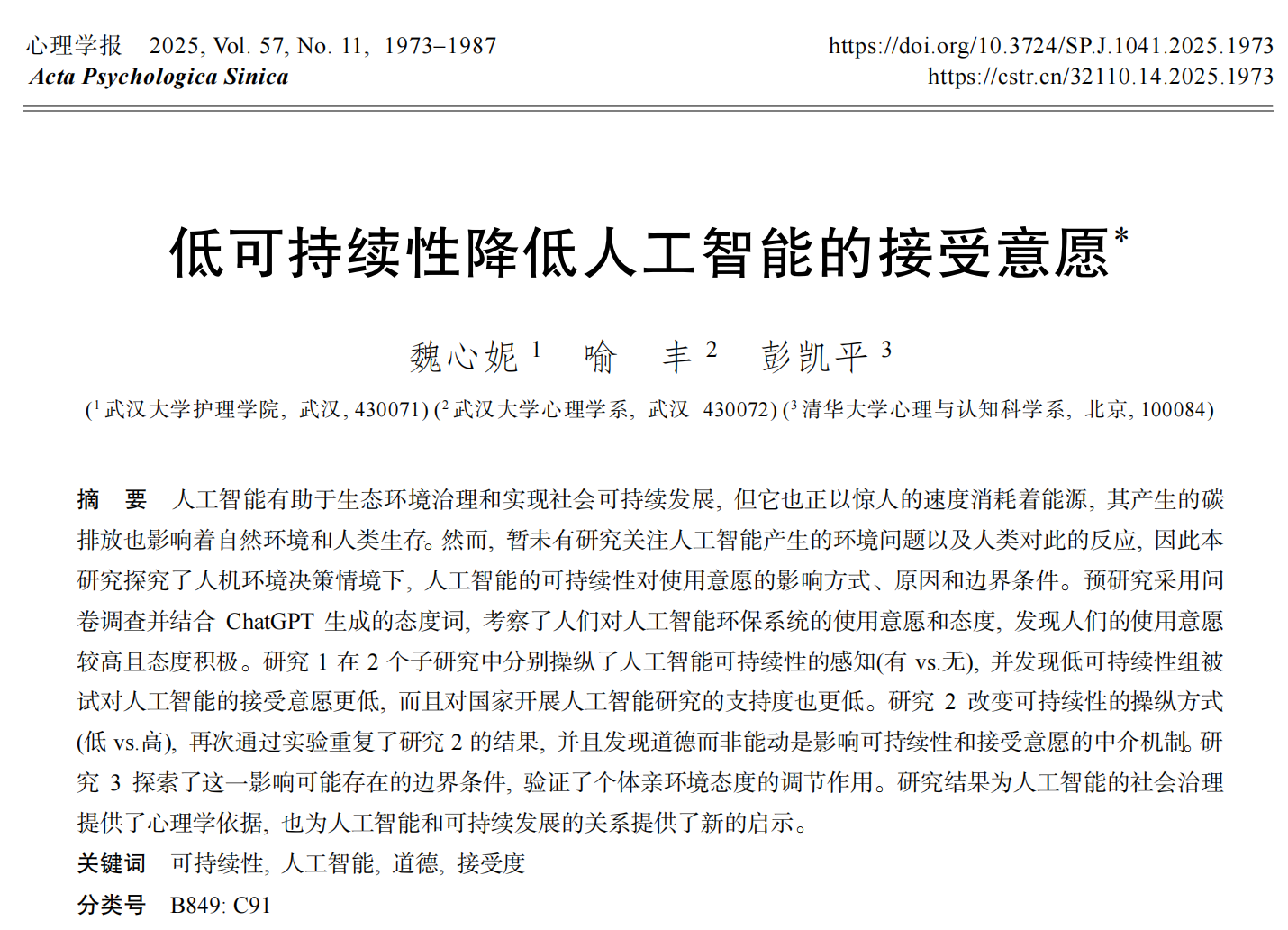 魏心妮副研究员与心理学系喻丰教授、清华大学彭凯平教授合作,在心理学领域中文顶刊《心理学报》发表题为《低可持续性降低人工智能的接受意愿》的研究论文。该研究从环境心理学视角出发,系统探讨了人工智能(AI)的可持续性对公众接受意愿的影响,并揭示了其背后的道德心理机制。
