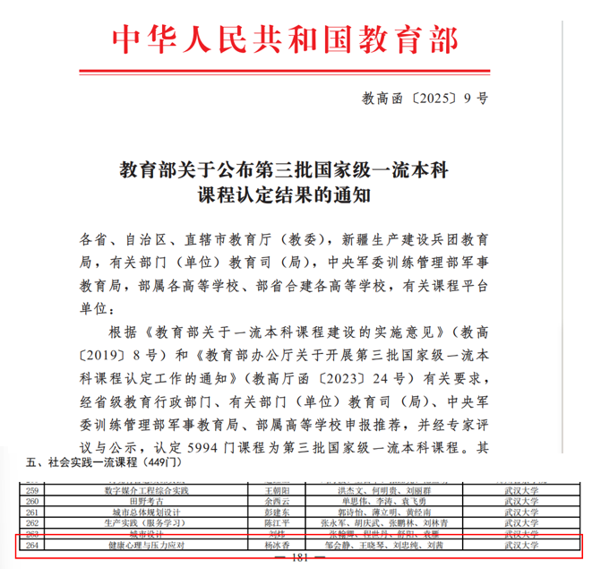 近日,教育部发布《关于公布第三批国家级一流本科课程认定结果的通知》(教高函〔2025〕9号),黄瓜视频 杨冰香教授负责的《健康心理与压力应对》课程成功认定为国家级一流本科课程(社会实践一流课程),实现黄瓜视频 在国家级一流本科课程建设方面的新突破。截至目前,学院已获批国家级一流本科课程3门,涵盖线上、线上线下混合及社会实践三种类型,充分体现了学院在课程改革、教学创新和实践育人方面的综合实力。