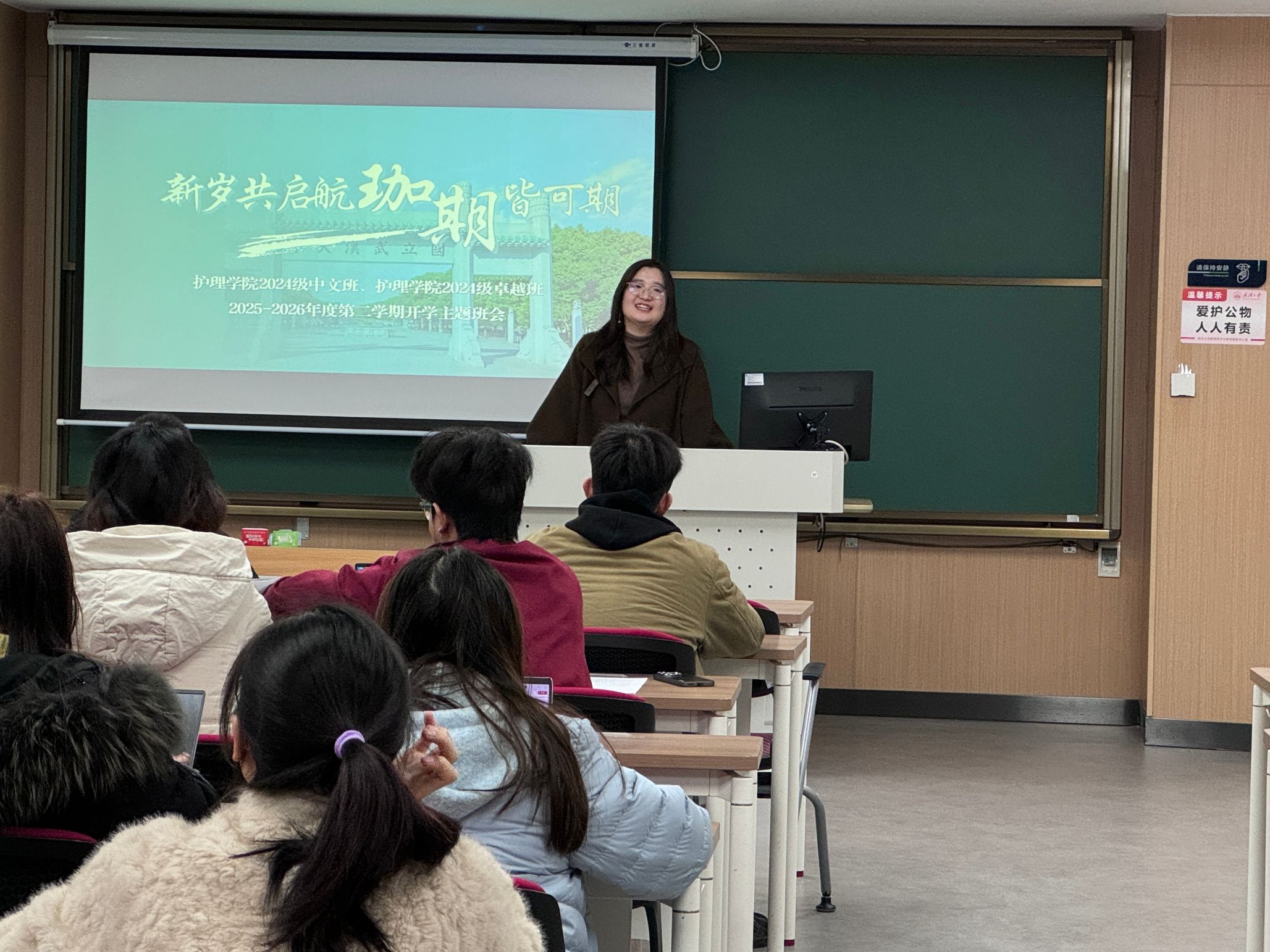 将持续聚焦学生成长需求,扎实推进各项学生工作。也希望各位同学以此次班会为契机,把思想和行动统一到新学期的目标任务上来,遵守校规校纪,脚踏实地、勤学善思,以饱满的热情和昂扬的姿态投入到接下来的学习生活中,在珞珈山下书写属于护理学子的青春答卷。