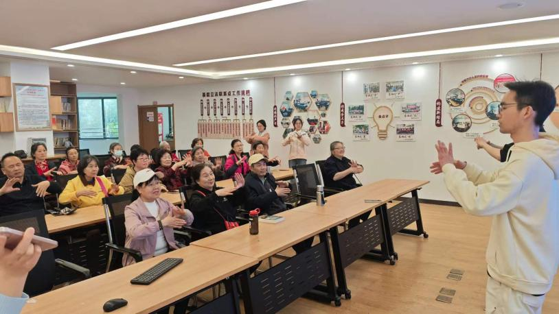 活动的最后,志愿者们带领老人们一同练习手指八段锦。志愿者们先细致讲解每一个动作的要领,手把手纠正老人们的姿势,随后伴着舒缓的节奏,带领大家一招一式认真练习。手指八段锦简单易学、运动量适中,非常适合老年人日常锻炼,既活动了手指关节、舒缓了身心,又让老人们掌握了一项实用的居家健身技能,老人们跟着练习得十分认真,现场氛围温馨又和谐。