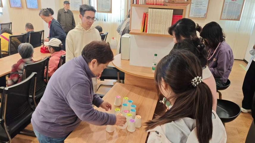 为了让活动氛围更加轻松愉悦,志愿者们还精心设计了“找朋友”纸杯配对小游戏。简单有趣的游戏规则瞬间吸引了老人们的参与热情,大家纷纷踊跃加入,在游戏互动中相互协作、彼此交流,现场欢声笑语不断,不仅拉近了志愿者与老人之间的距离,也让老人们在趣味互动中收获了快乐。