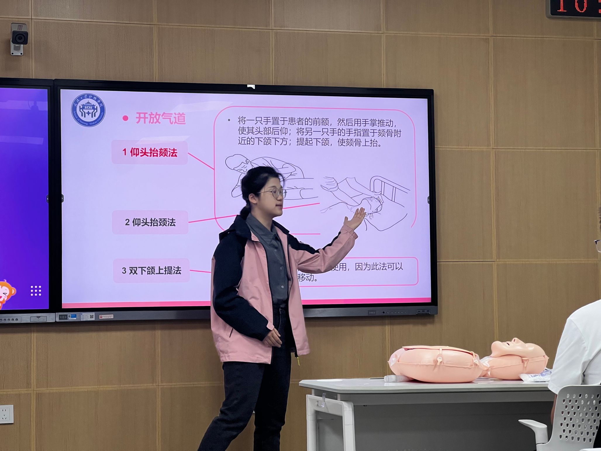 宣讲人韦清妍阐述了心肺复苏的完整步骤。利用现场提供的模拟道具,开展了急救演练,让同学们深切体会到了迅速采取行动和团队协作在急救过程中所起到的关键作用。