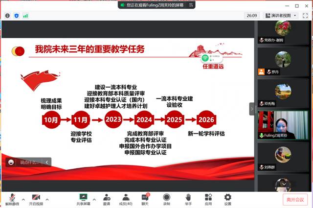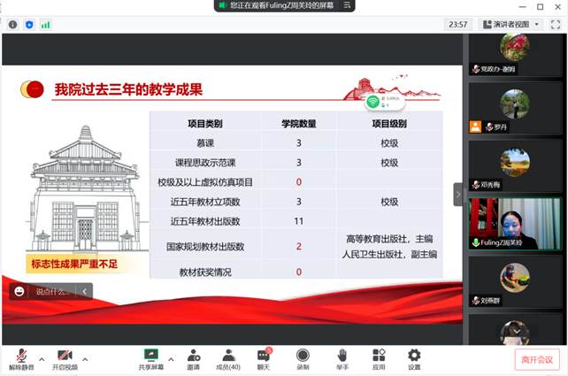 最后,周芙玲为大家详细介绍学院在促进教学改革发展,提升人才培养质量方面所采取的举措。学院整合附属医院资源,遴选优秀临床师资,建立双师型队伍,为进一步促进理论和实践融合,推进课程建设储备了师资基础。学院还加强教发分中心建设,制定了高水平教学成果培育管理办法,多角度为教师创造条件,鼓励教师创造性地开展教学研究和实践,争取促成更多高层次、高质量、高水平的教学成果。