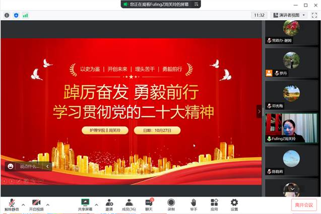 在线上举行党的二十大精神专题学习会,学院全体教职工、学生党员参会,学习会由院党委委员、院长周芙玲主讲,教工支部书记张青主持。