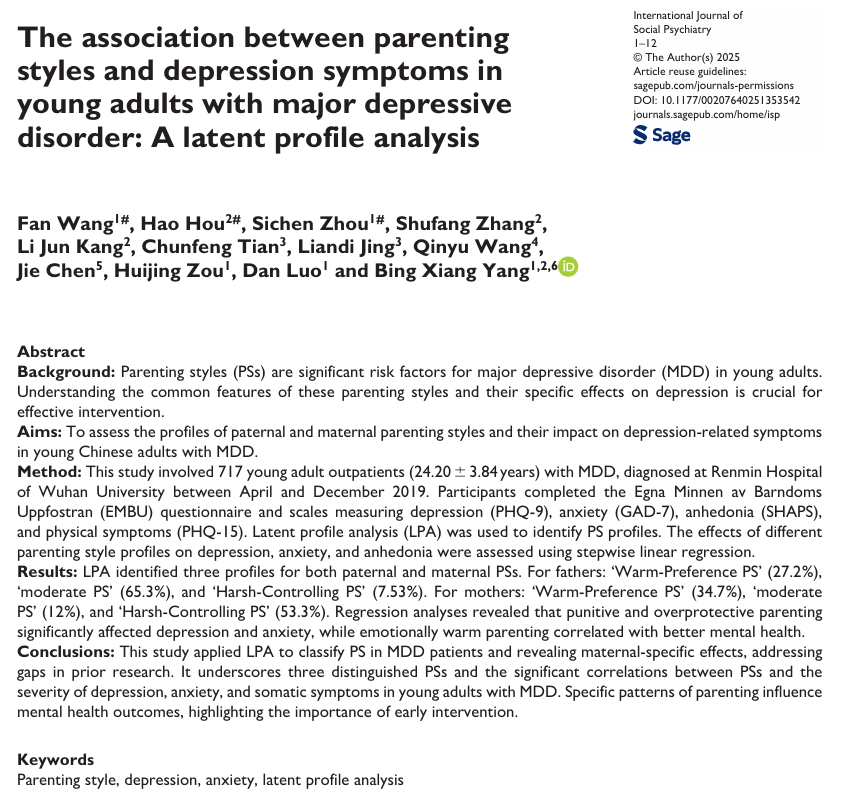 近日,中心杨冰香教授课题组硕士研究生王凡在《International Journal of Social Psychiatry》(中国科学院三区,JCR二区;IF=2.5)期刊上发表了基于潜在剖面分析方法探索住院重度抑郁障碍患者父母教养方式和疾病症状关联的最新研究成果(见图1)。论文题目为“The association between parenting styles and depression symptoms in young adults with major depressive disorder: A latent profile analysis”。黄瓜视频